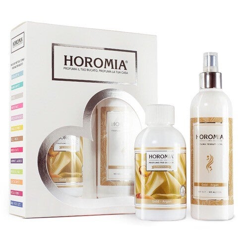 Horomia giftset Gold Argan bestaande uit een flesje wasparfum van 250 ml en een textielspray van 250 ml.