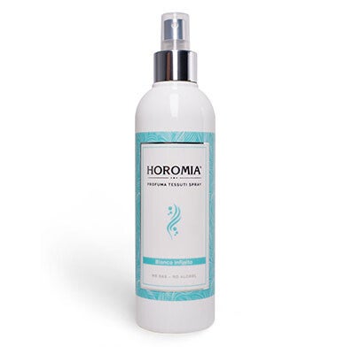 Horomia textielspray Bianco Infinito, een heerlijke geurmix van magnolia, vanille en witte musk.