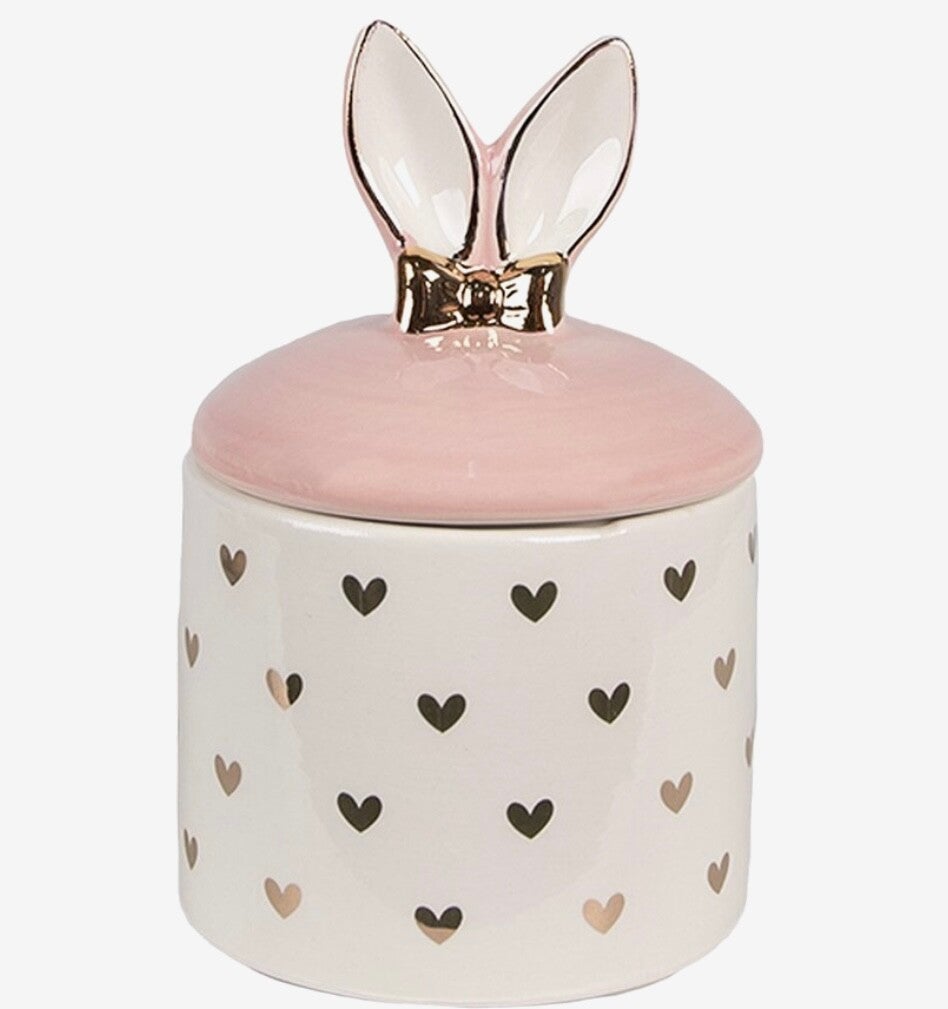 Een charmante opbergpot in pastelkleuren, versierd met hartjes en schattige konijnenoren op het deksel, biedt praktische en esthetische opslag voor kleine items. Een mooi cadeau of stijlvolle paasdecoratie