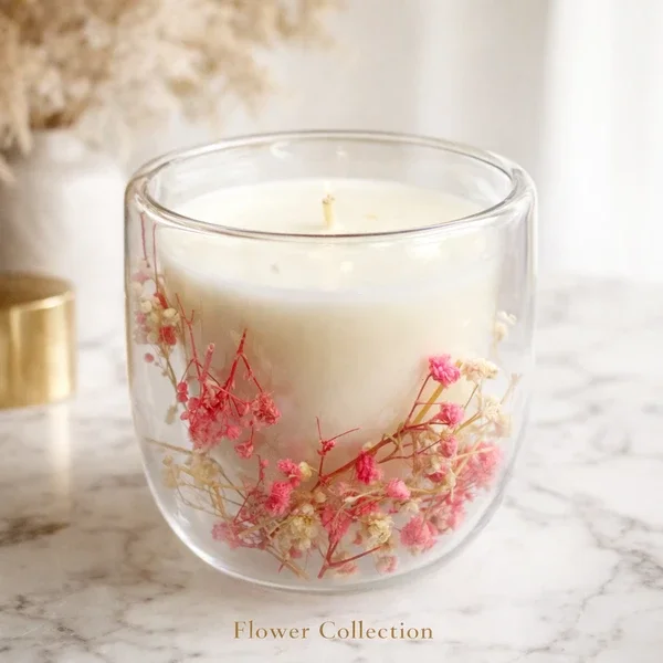 Een stijlvolle geurkaars in dubbelwandig glas met echte droogbloemen. Een luxe blikvanger voor je interieur én een heerlijke geur in huis.
